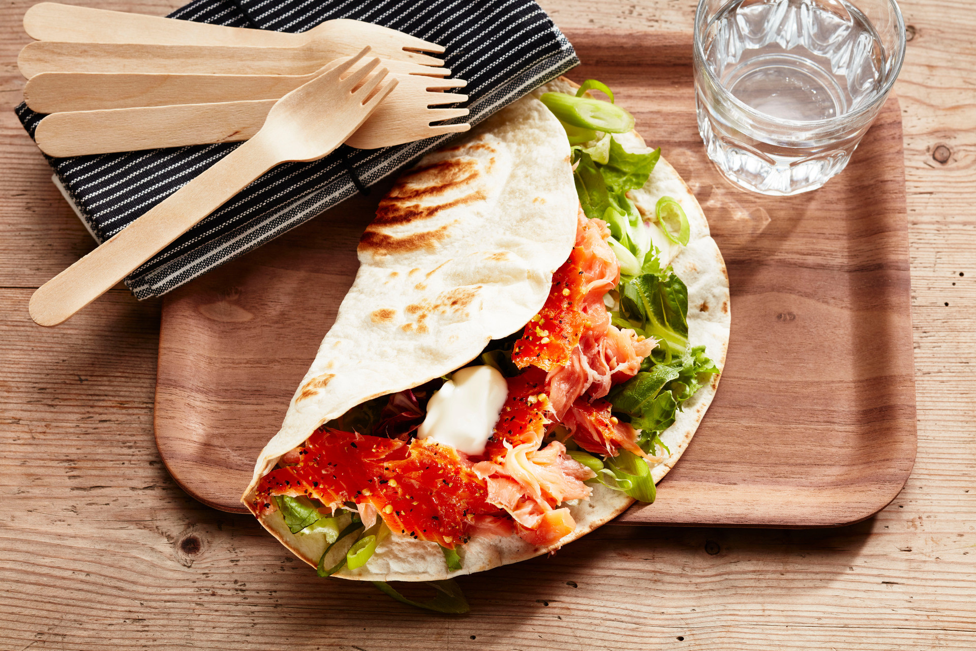 2. Remplissez chaque tortilla de salade et d’oignons nouveaux émincés. Garnir de flocons de saumon fumé à chaud et de quelques cuillères à soupe de yaourt nature.